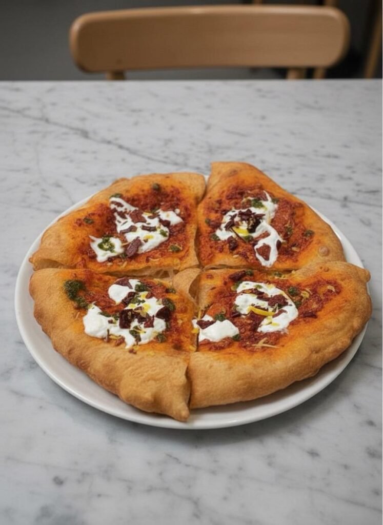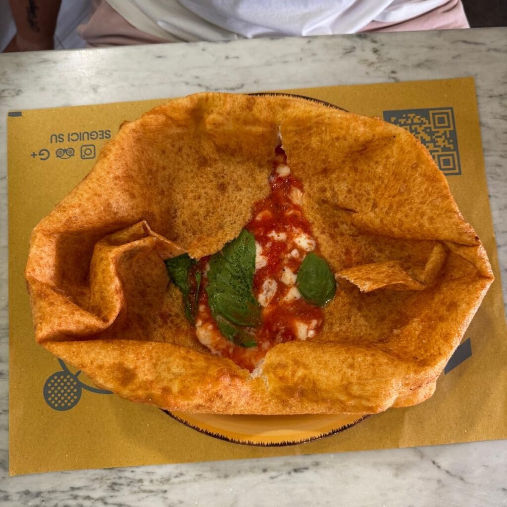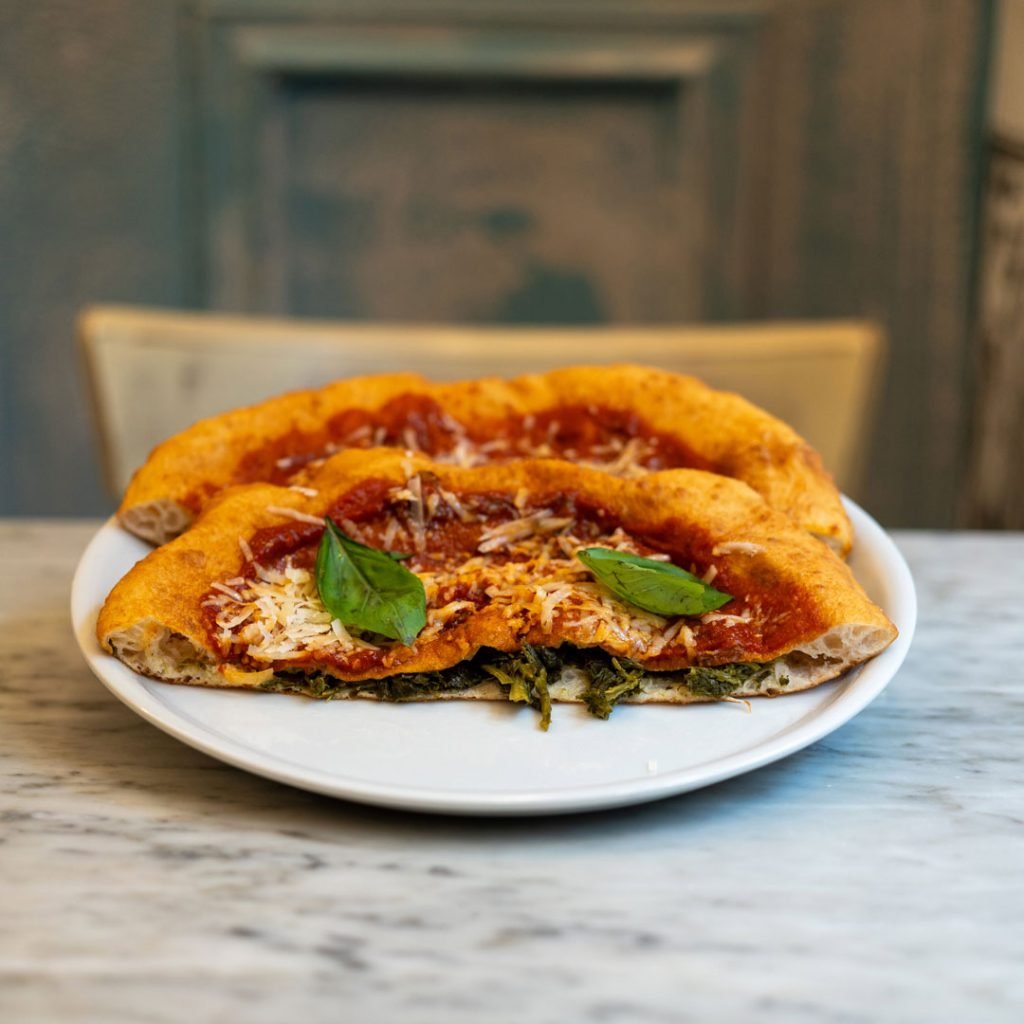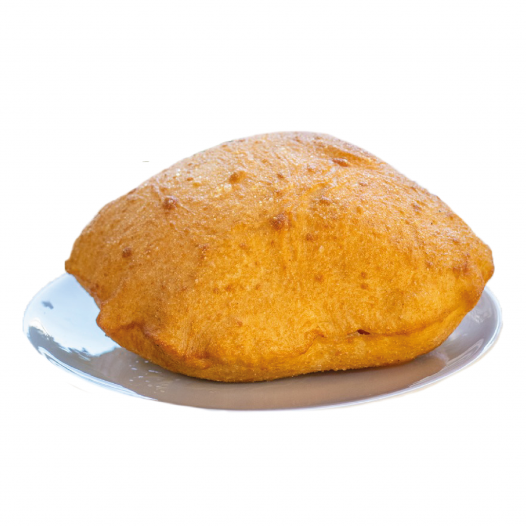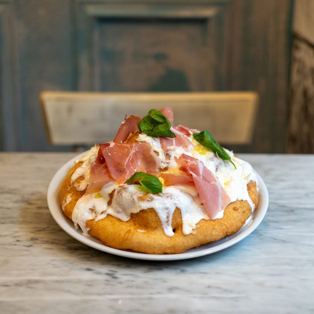Fried pizza base, stracciatella cheese, Neapolitan ragù, basil, caciocavallo shavings.